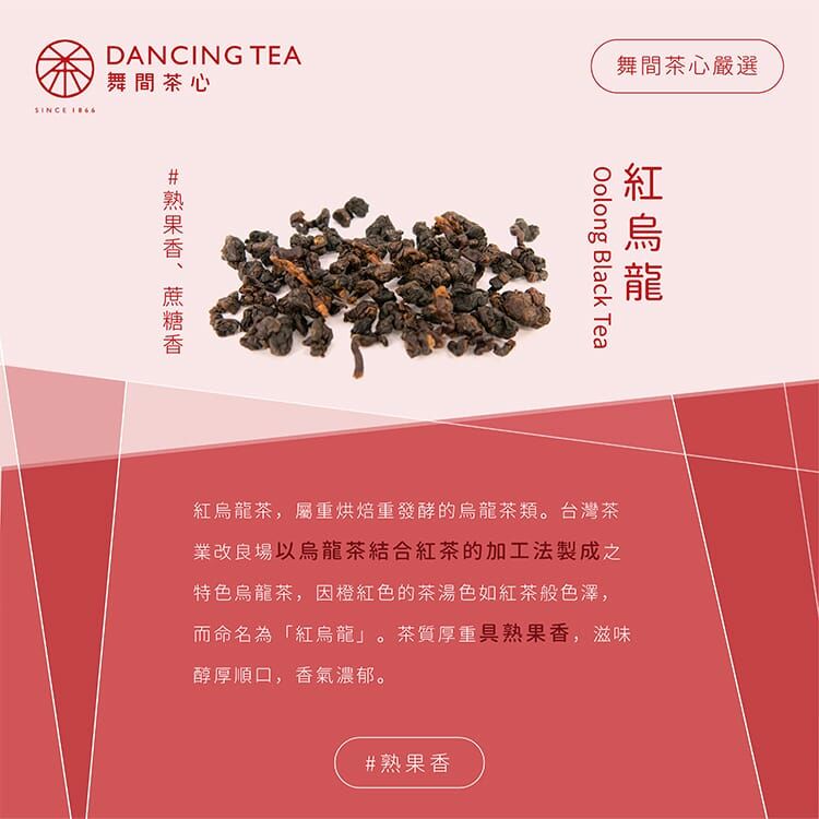 紅烏龍必須以一心二葉茶芽以手工方式採摘,採重萎凋、全發酵方式,外觀形狀為半球型色澤暗紅帶有光澤,茶湯水色琥珀橙紅,明亮澄清,茶質厚重具熟果香,滋味醇厚圓滑、富有活性、耐泡、甘醇,紅烏龍屬著重烘焙之烏龍茶,長久存放不易變質,適合當陳年茶典藏。